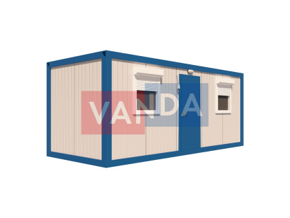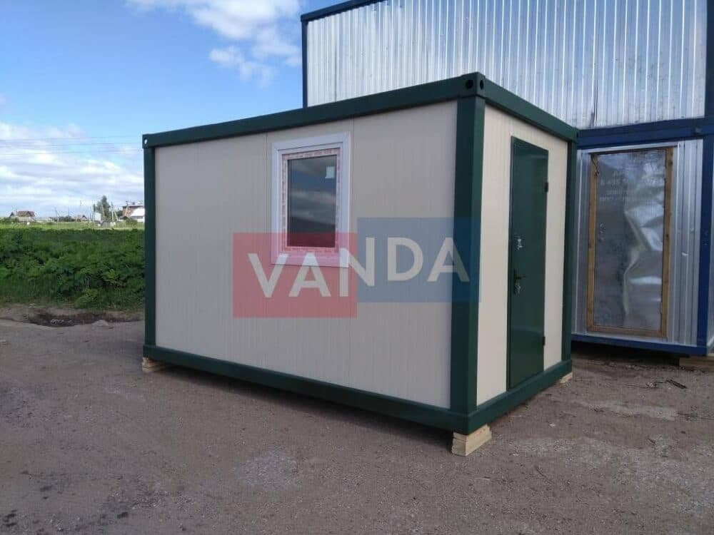 Данный контейнер не требует обустройства тяжеловесного фундамента, поскольку постройка легкая и устойчивая. Данный блок-контейнер может быть выполнен абсолютно любого размера и формы по эскизу заказчика.Контейнер состоит из металлического сварного основания. Стены изготовлены из сэндвич-панелей с прокладкой утеплителя. Крыша покрыта крашенным холоднокатаным металлом 1,2 мм. Помещение обустроено пароизоляцией при помощи технической пленки, которая проложена на полу и потолке. Внутренняя облицовка потолка выполнена из ПВХ-панелей, пол – из шпунтованной доски. Вход в помещение оборудован запирающейся металлической дверью.
